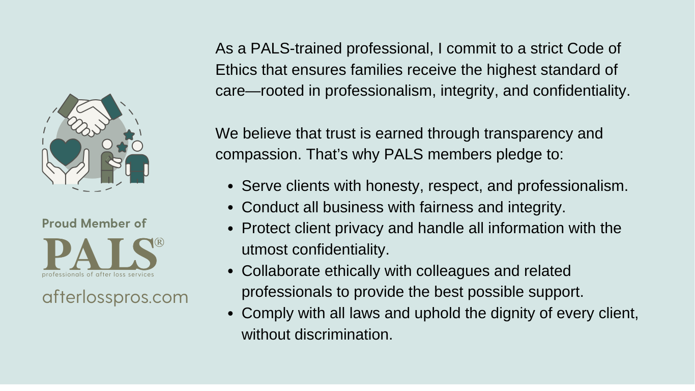 I came to realize that my administrative, project management, and organization skill sets in addition to my comfort around grief made me a good candidate to become that professional whom I wished I had several years before. Around this time, I learned of an emerging group of people doing that kind of work professionally…Professionals of After Loss Services. I felt called to join their ranks and become fully trained subject matter expert in 2025.